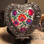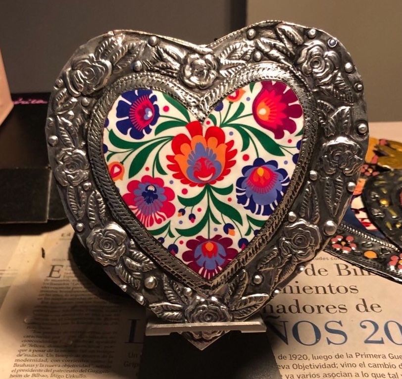Corazón decorativo repujado, pintado y envejecido a mano con imagen de Flores.