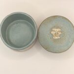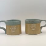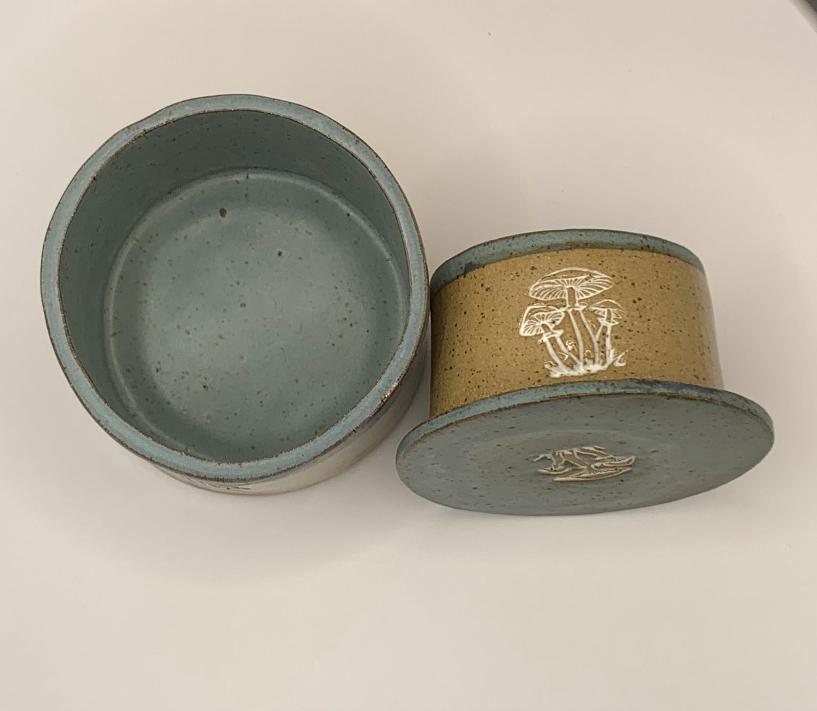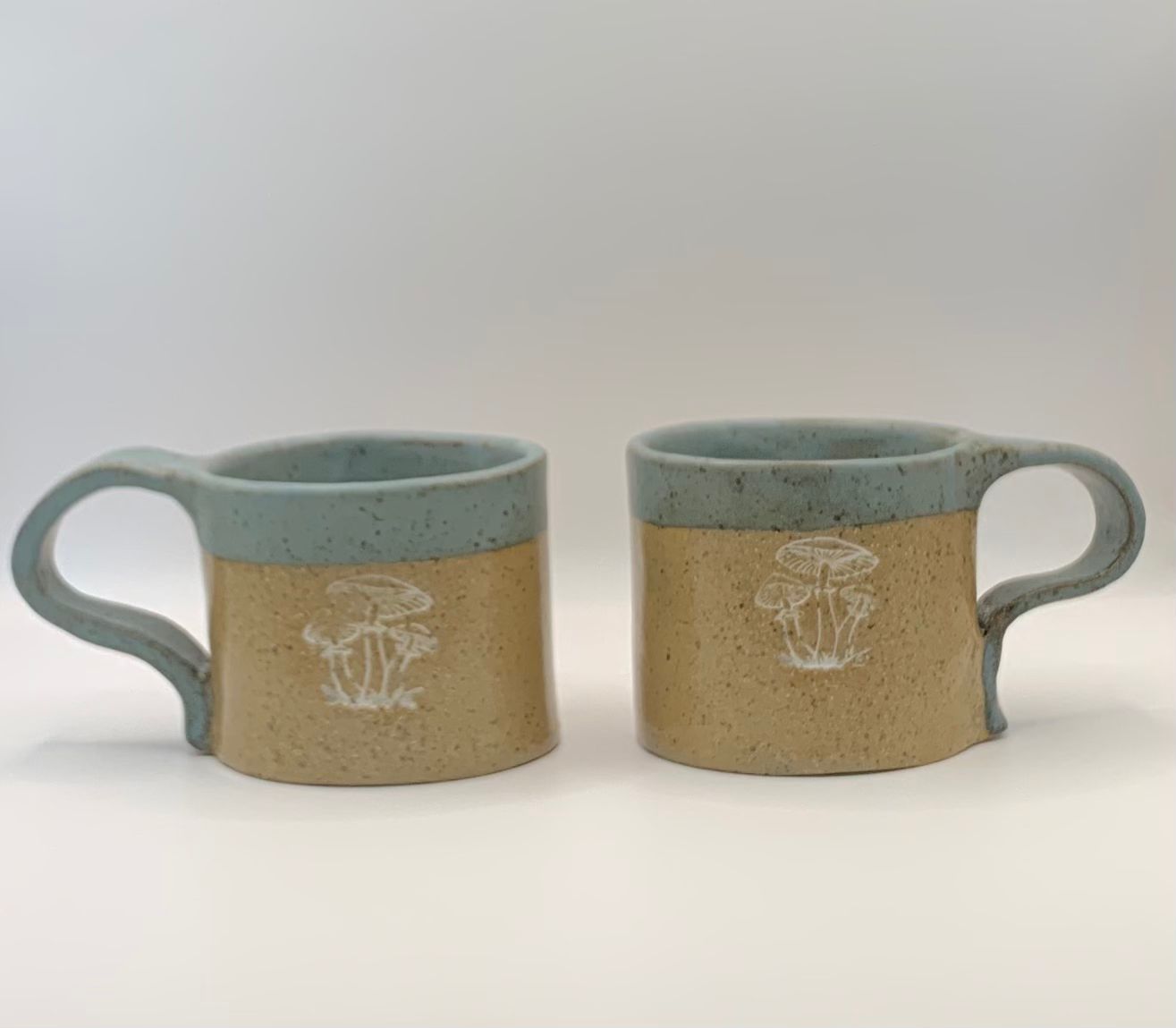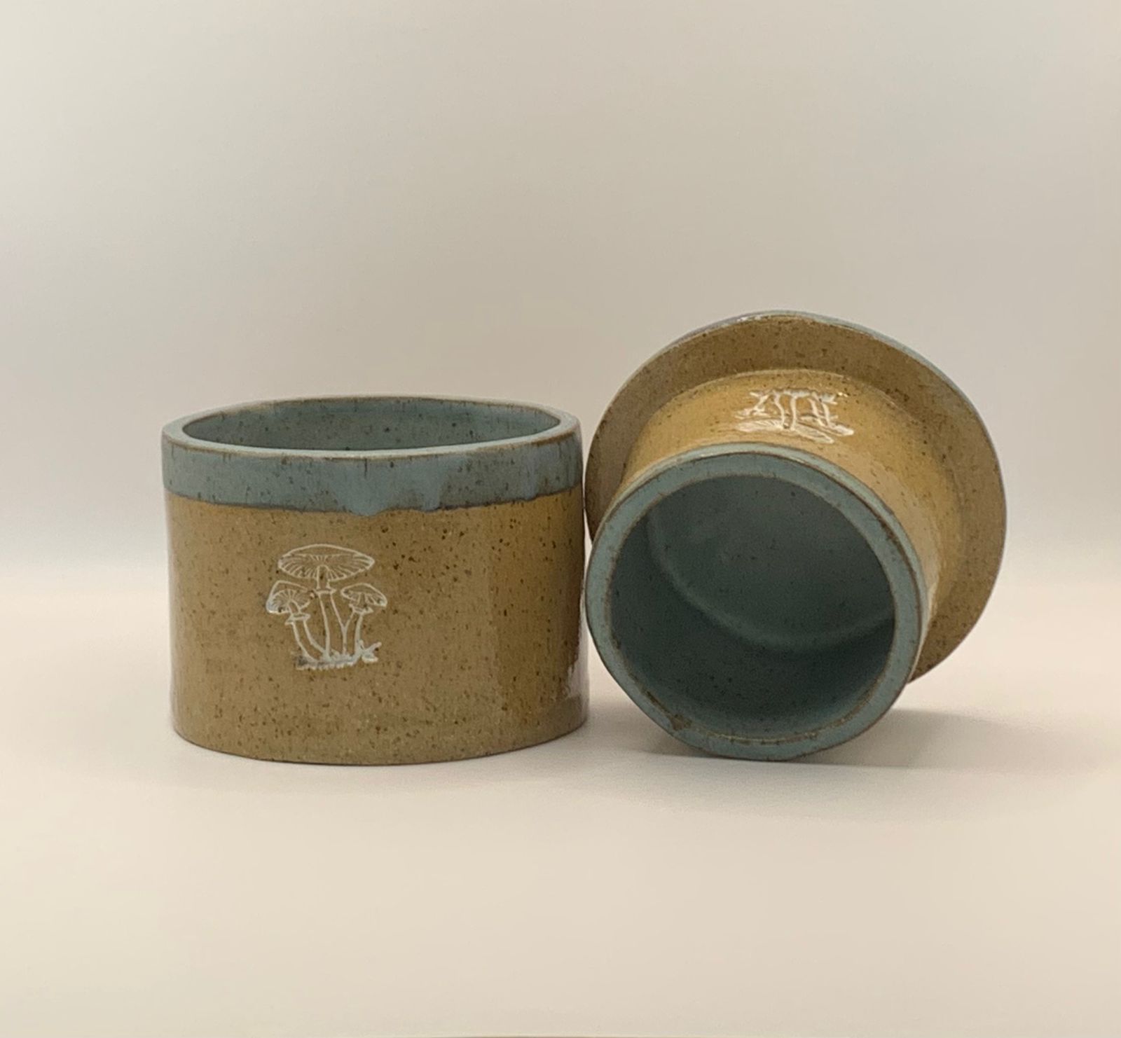 Tazas y Mantequillera Francesa en Cerámica Grez esmaltada, con diseño de hongos.