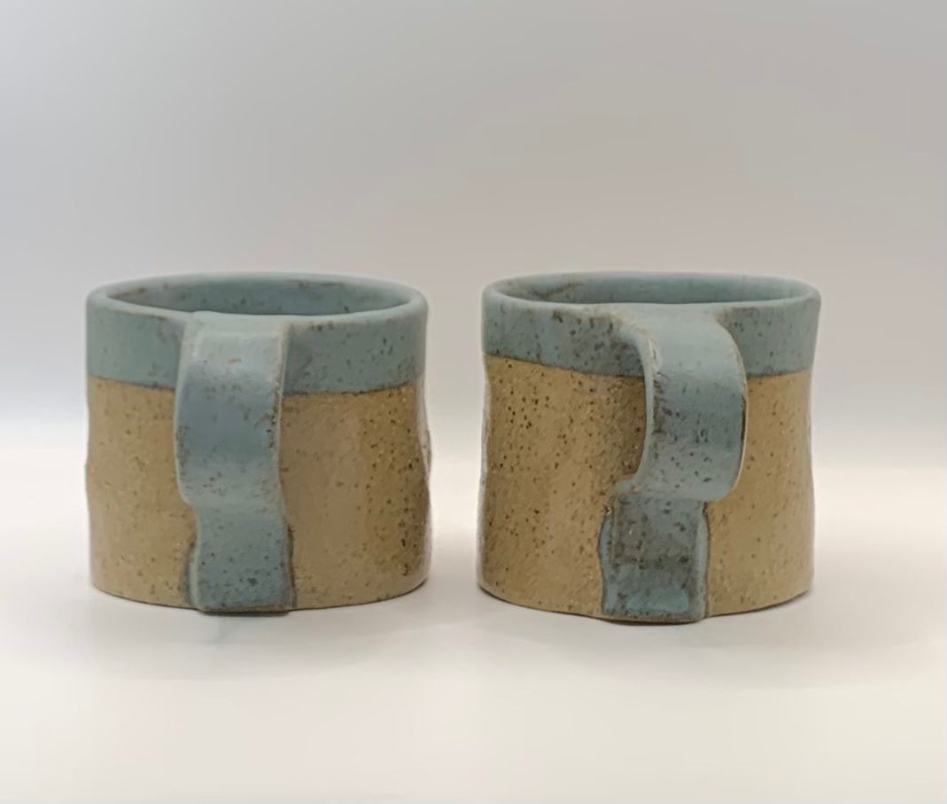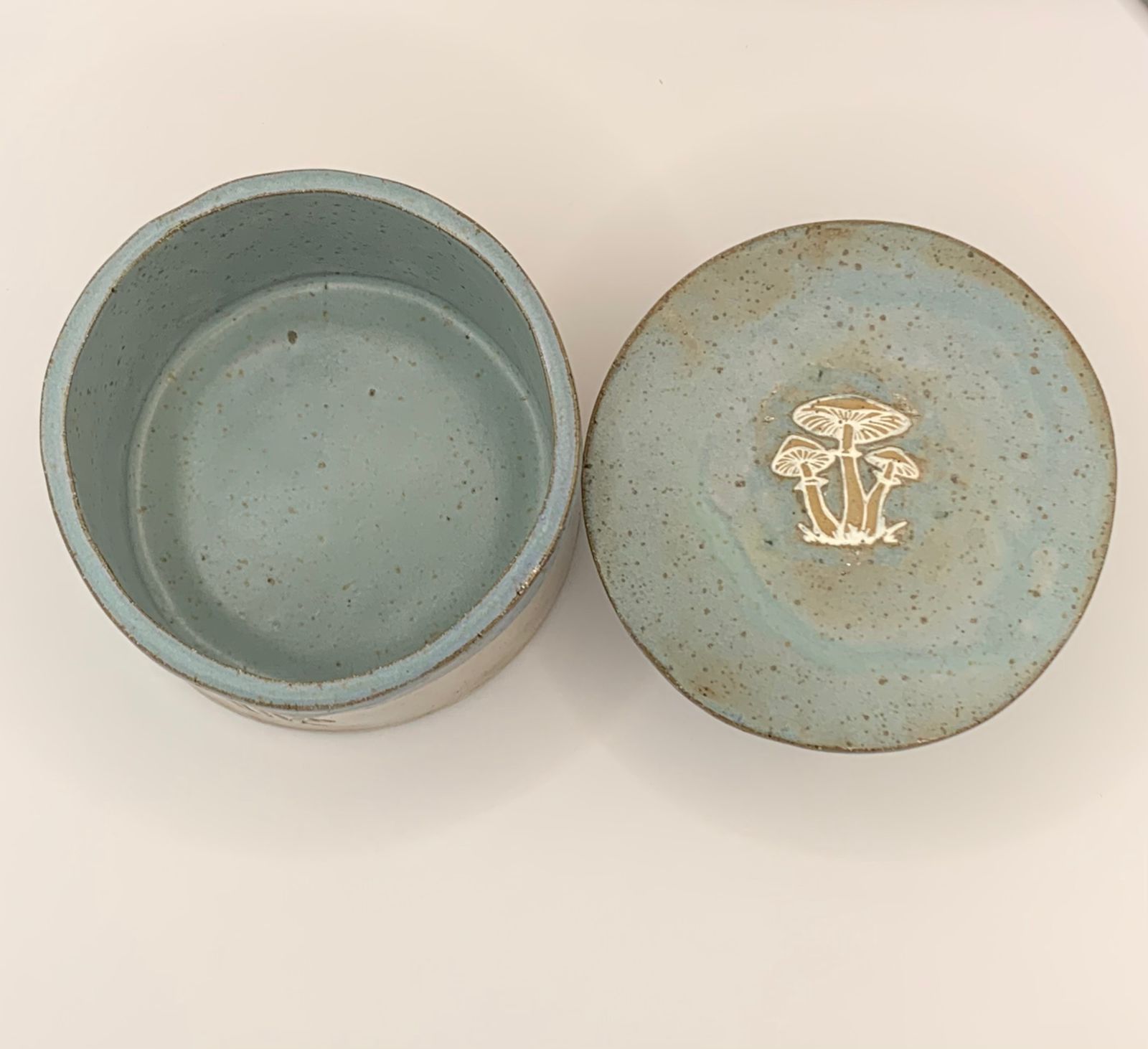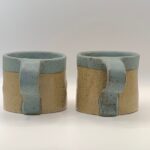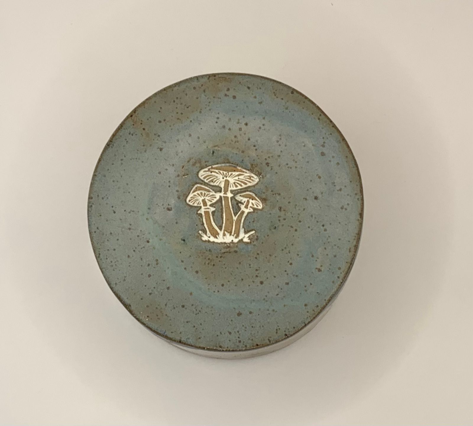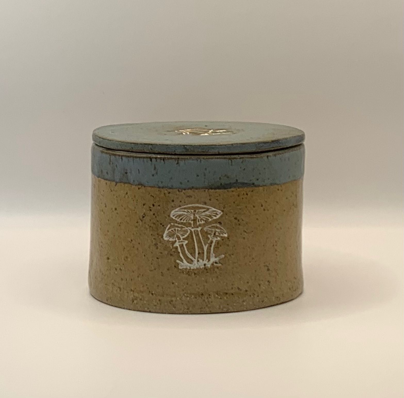 Tazas y Mantequillera Francesa en Cerámica Grez esmaltada, con diseño de hongos.