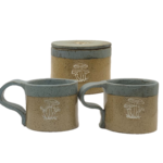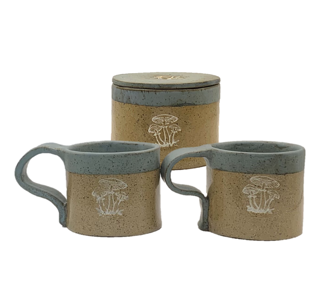 Tazas y Mantequillera Francesa en Cerámica Grez esmaltada, con diseño de hongos.