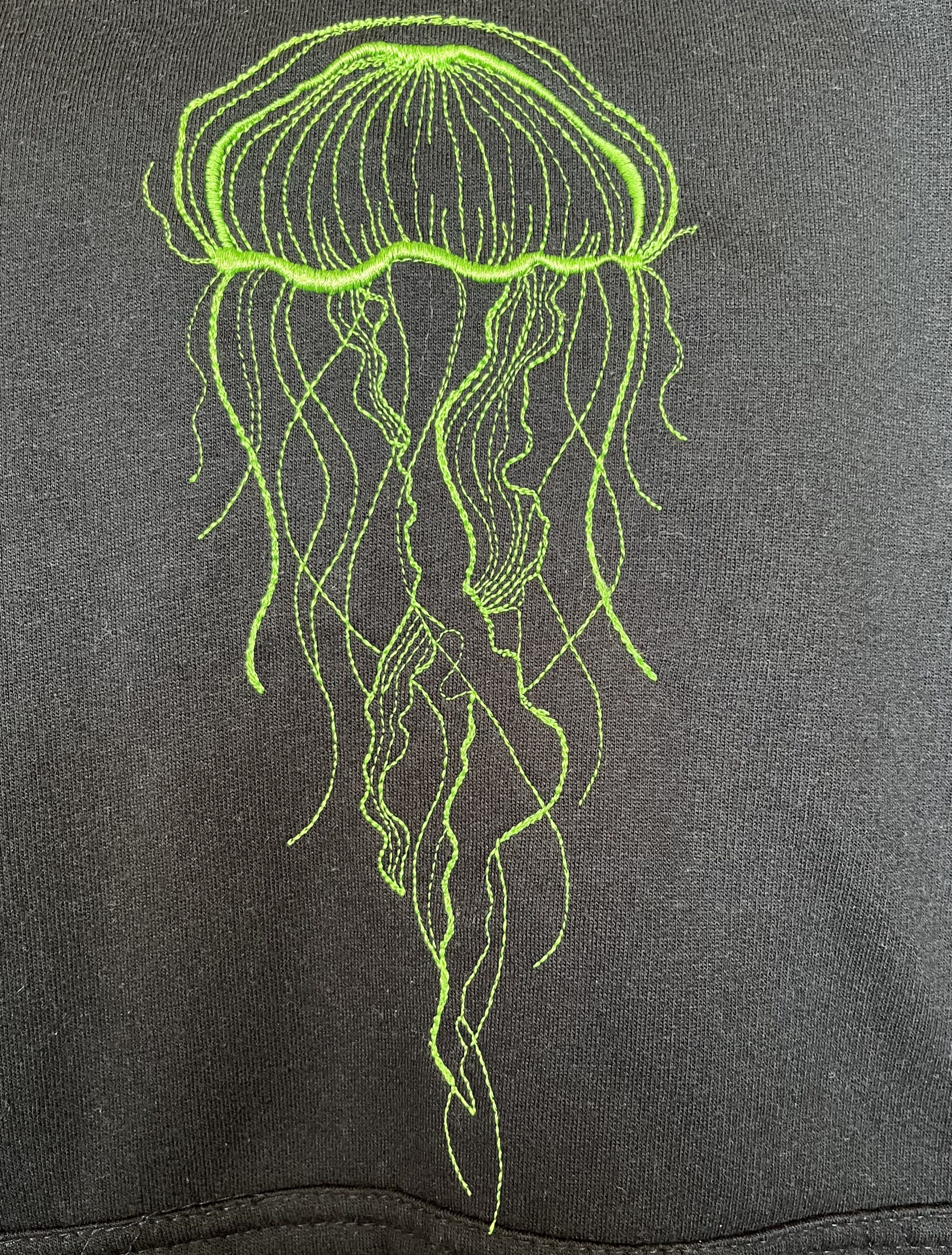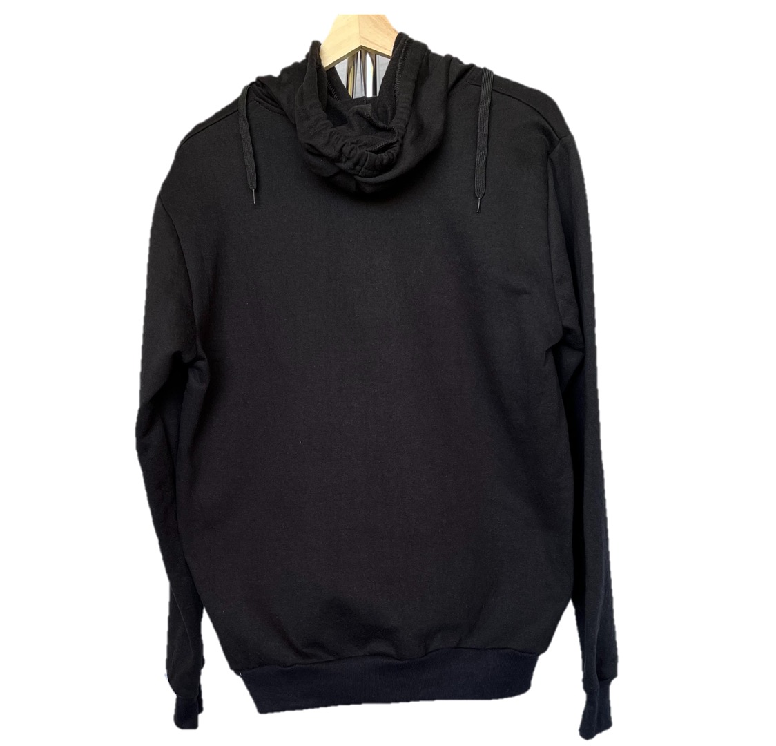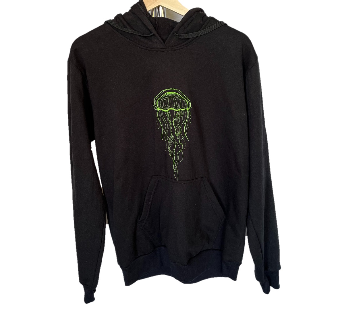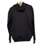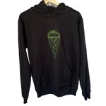 Polerón negro con capucha y diseño de Medusa verde bordada en la parte frontal.